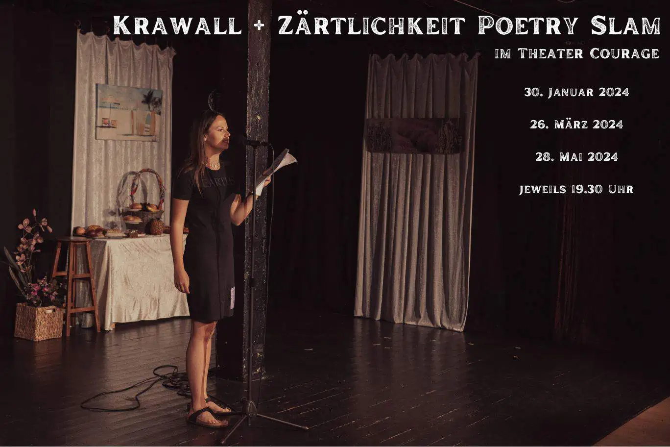 Der Krawall + Zärtlichkeit Poetry Slam ist zurück! Gut drei Jahre nach der letzten Ausgabe im Soulhell Café haben wir ein neues Zuhause für den Neuanfang gefunden: das wundervolle Theater Courage in Essen-Rüttenscheid. Seit April 2023 kannst du hier nun ca. alle zwei Monate großartige Slam-Abende mit ausgewählten Künstler:innen erleben. Die nächsten Termine sind der 30. Januar, der 26. März und der 28. Mai – jeweils um 19.30 Uhr.
